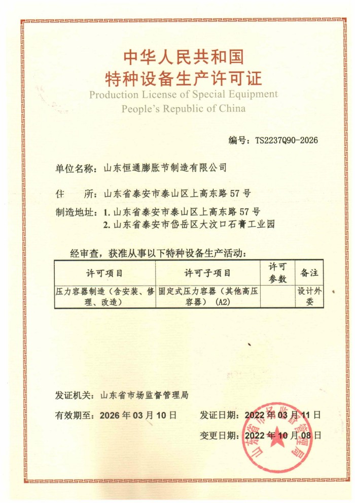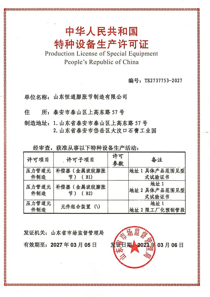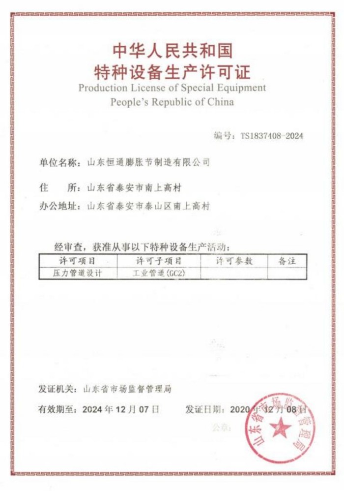 公司取得我國特種設備制造許可證、壓力容器A1級資質、壓力管道元件A、B的資質,并且獲得了歐盟PED-CE認證、美國ASME“U”鋼印、ISO 9000質量管理體系認證、GB/T 14000 環(huán)境管理體系認證及GB/T 45000 職業健康安全體系認證。膨脹節(jié)產品涵蓋壓力管道波紋膨脹節(jié)、壓力容器波形膨脹節(jié)、金屬波紋管、金屬軟管、聚四氟補償器、橡膠補償器及非金屬補償器等。